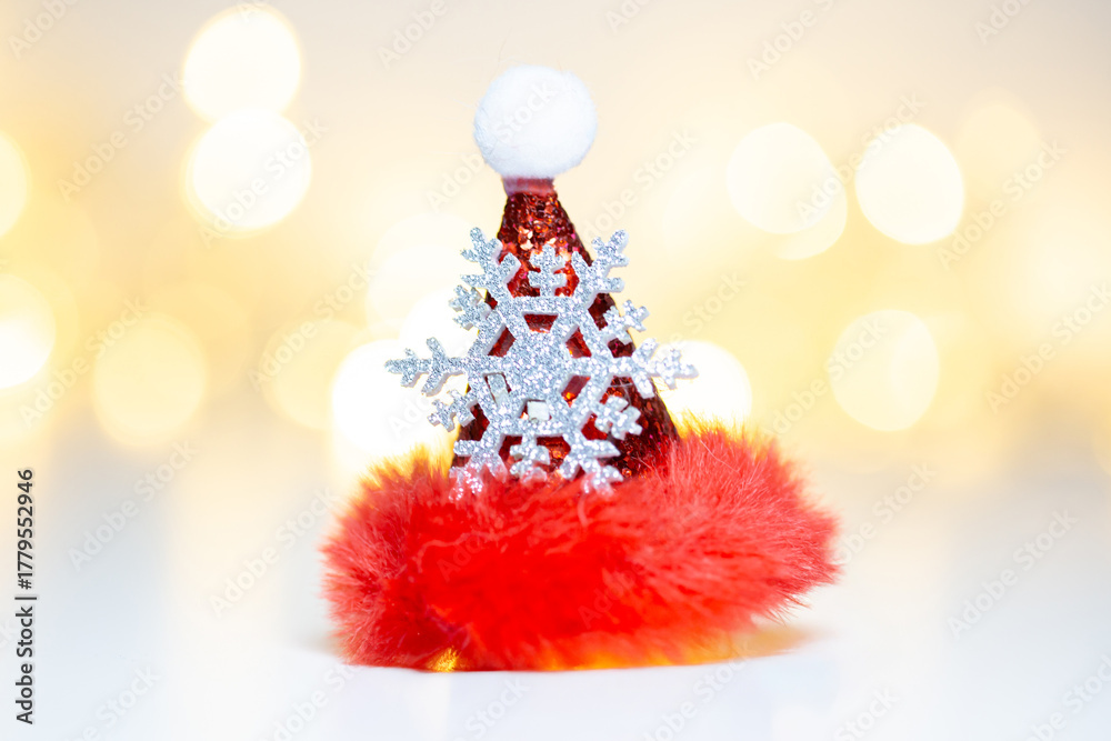 Mini Santa Hat with Silver Snowflake Decoration and Golden Bokeh