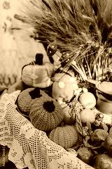 Stylish Rustic Autumn still life with hand knitted pumpkins, dry wheat