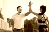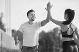 Running outdoors, happy sporty couple, fit man and woman happily high fiving, smiling brightly, expressing joy celebrating shared fitness achievement, sunny outdoor morning sport starting to move