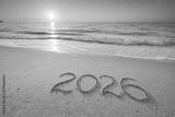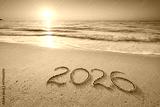 2026 text symbol of new year on the sea sand beach shore during sunset.