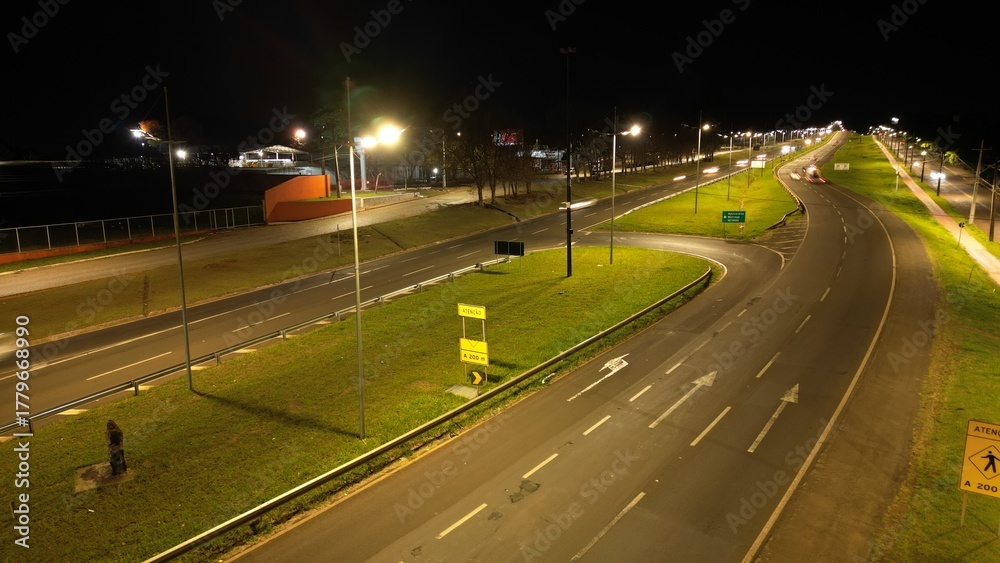 Drone top-down shot of a night highway with an illuminated skatepark or public space in the median, surrounded by moving traffic and streetlights. Perfect for urban mobility or infrastructure themes.