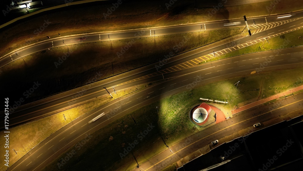 Drone top-down shot of a night highway with an illuminated skatepark or public space in the median, surrounded by moving traffic and streetlights. Perfect for urban mobility or infrastructure themes.
