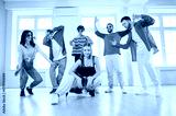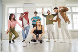 Dancing modern group of young people posing confidently, energetically, diverse team standing gesturing in bright indoor gym studio, feeling cool practicing with dance coach for performance
