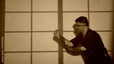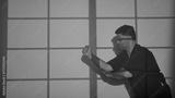 A man in a black kimono practices martial arts using shadowboxing against a light colored grid background. A man conducts training in the Chinese martial art of Wing Chun.