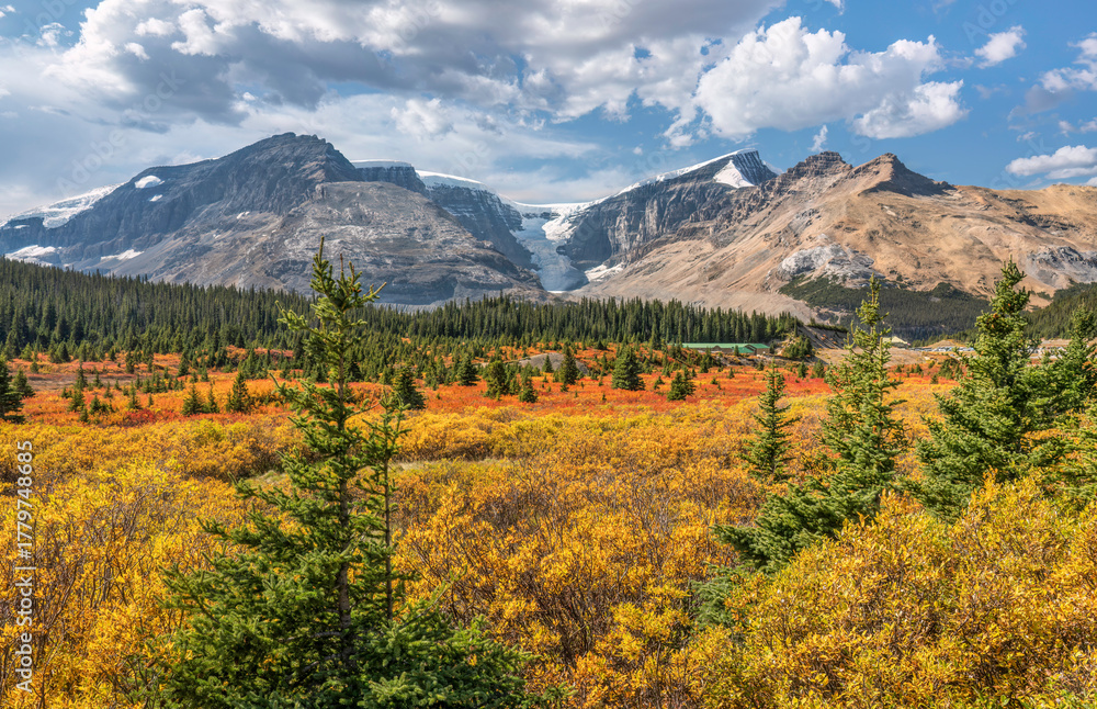 Autumn colors with view of the Stutfield Glacier at the Columbia Icefield on the Icefields Parkway