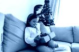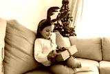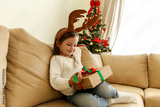 Happy little girl with reindeer antlers headband sits on a cozy beige sofa holding a Christmas gift box with red and green ribbon, smiling near a decorated Christmas tree.