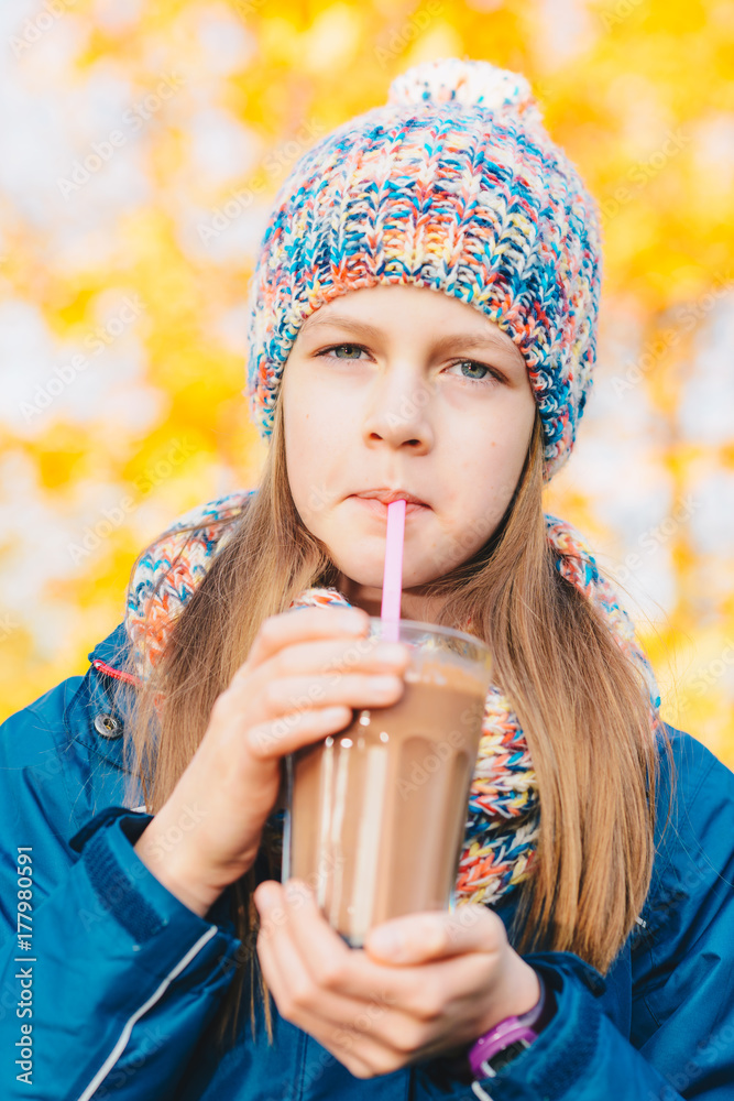 Young girl with a glass of chocolate milk drink