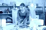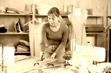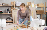 Skilled young female seamstress cutting natural linen fabric with scissors on worktable, preparing pieces for garment assembly in sewing studio