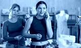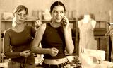Young female client chatting on phone while professional dressmaker taking body measurements in modern tailoring workshop, preparing for custom-fit garment