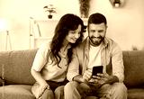 Couple family using smartphone together, browsing and reading social media feed at home. Young man and woman sitting on cozy sofa with smiles, look at phone screen, plan shopping, read good news