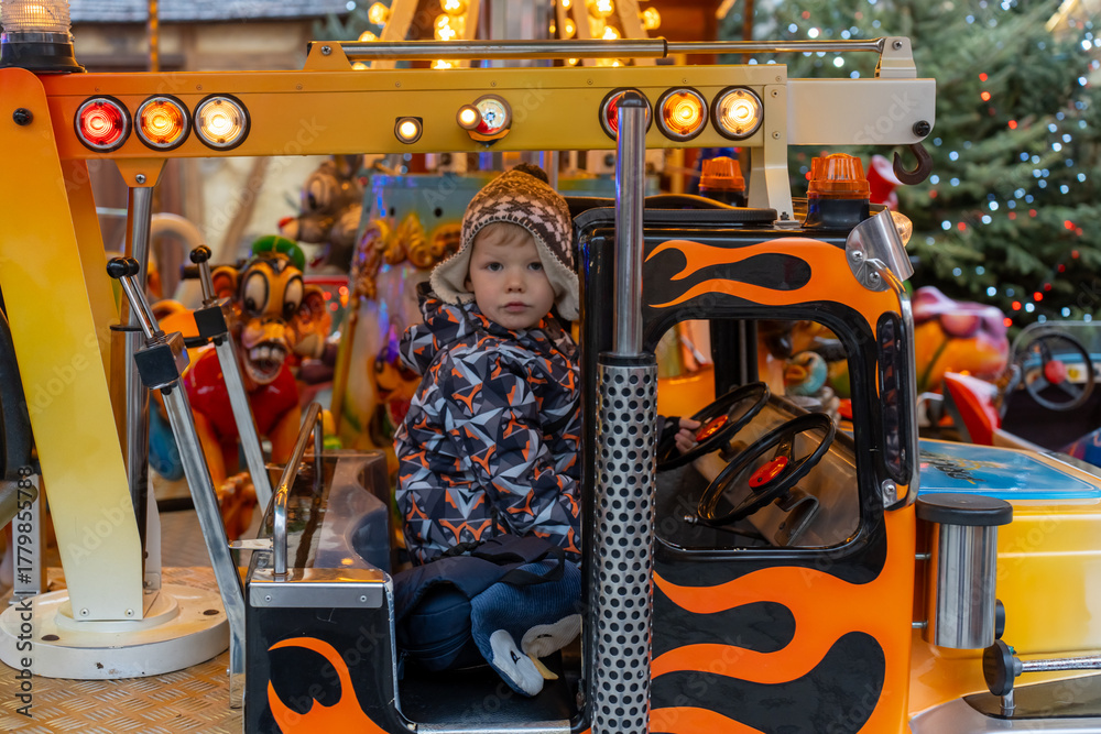 Little boy in winter hat sitting in orange truck cabin of colorful carousel ride with steering wheel and lights at Christmas market. Concept of childhood joy and festive amusement activities.