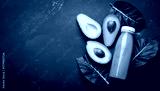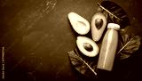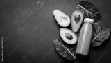 Vibrant green avocado smoothie in a plastic bottle with sliced avocados and a green leaf on a dark background copy space