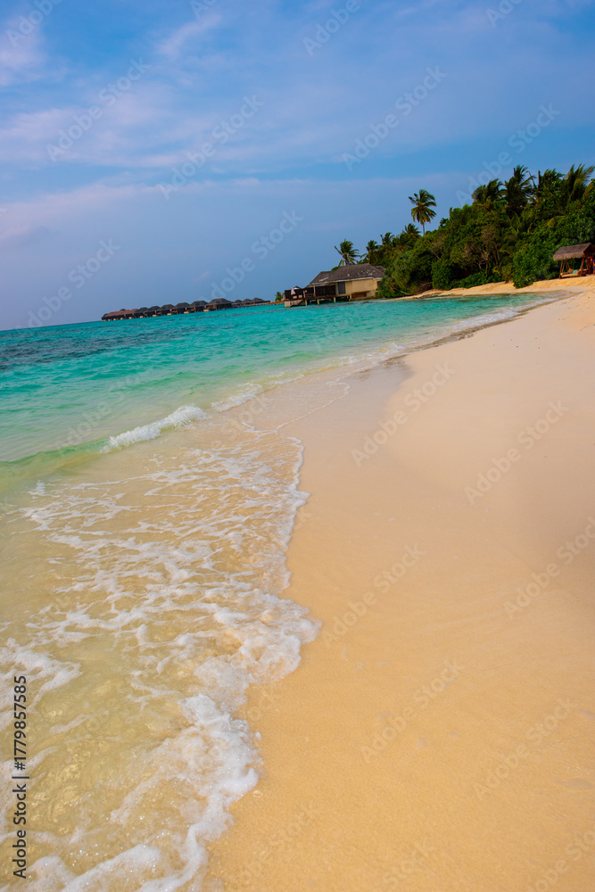 Tranquil closeup calm sea water waves with palm trees. Beautiful Panorama, Tropical island beach landscape exotic shore coast. Summer vacation, holiday amazing nature. Relax paradise, Maldives.