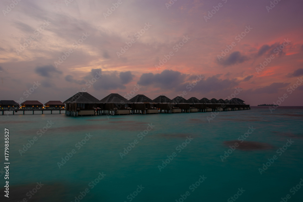 Tranquil closeup calm sea water waves with palm trees. Amazing sunset panorama. Tropical island beach landscape exotic shore coast. Summer vacation, holiday amazing nature. Relax paradise, Maldives.
