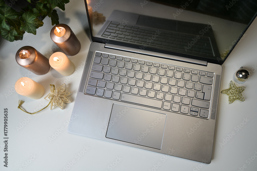 Laptop with candles and some Christmas decorations on a light office desk, holiday business or cozy workplace at home, copy space, high angle view from above