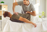 Professional doctor, chiropractor, osteopath or physiotherapist, helping man patient with back pain and tension. Chiropractic therapy, osteopathy, treatment, rehabilitation concept