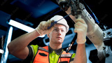An engineer works on an AI robotic arm, representing the future of work. This advanced manufacturing technology optimizes the supply chain and production efficiency.