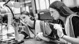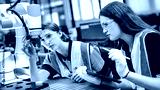 Two female engineers represent the future of work, using AI and robotics to optimize production. They are innovating for the high tech manufacturing supply chain.
