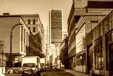 Downtown Montreal street view leading toward corporate towers and the skyline. Brick buildings, trucks and a crane frame the high rise core, highlighting the city's economic hub in Quebec, Canada.