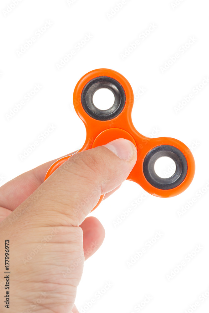 Man holding modern orange spinner isolated on white background
