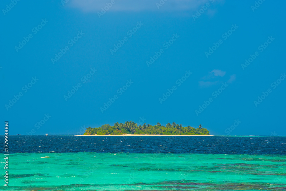 Small island. Summer vacation, holiday amazing nature. Relax paradise, Maldives. Tropical island beach landscape exotic shore coast. Tranquil closeup calm sea water waves with palm trees.