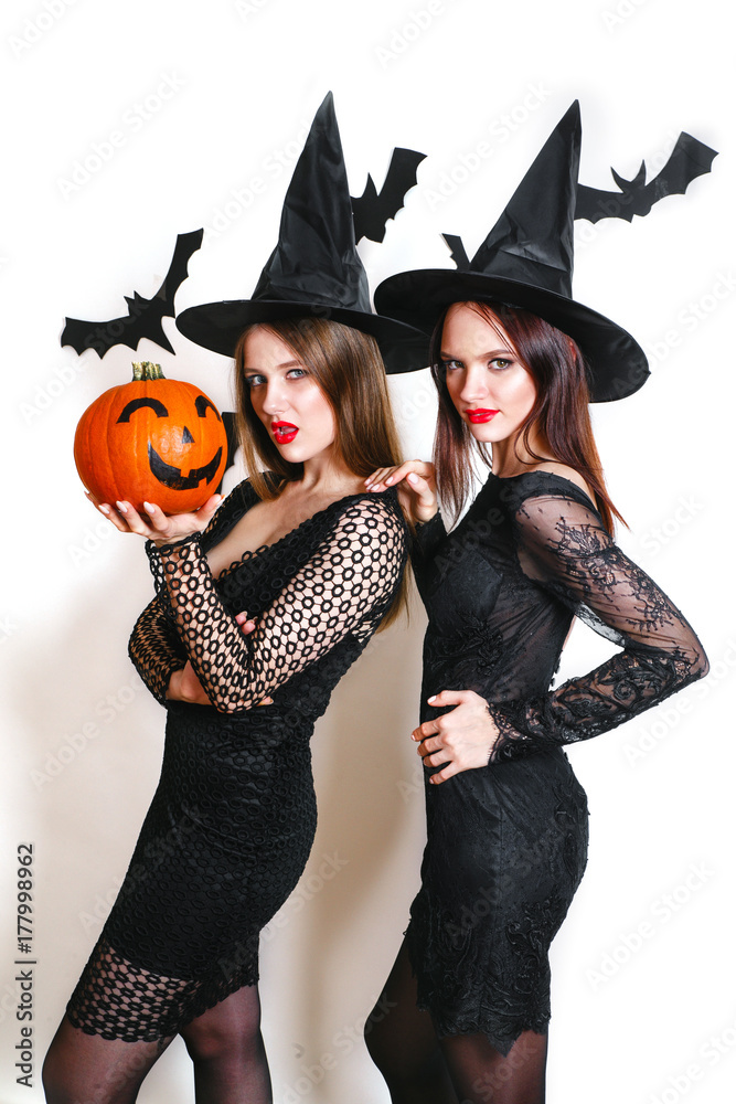 Two happy women in black witch halloween costumes with pumpkin on party over white background