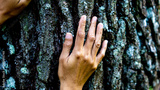 Hand touching tree. Bathing forest (Shinrin-yoku or mandi hutan) to reduce stress, blood pressure, improves mood and concentration.