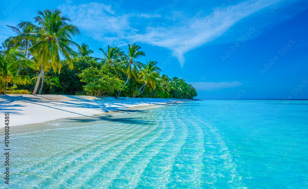 Tropical island beach landscape exotic shore coast. Tranquil closeup calm sea water waves with palm trees. Beautiful Panorama. Summer vacation, holiday amazing nature. Relax paradise, Maldives.