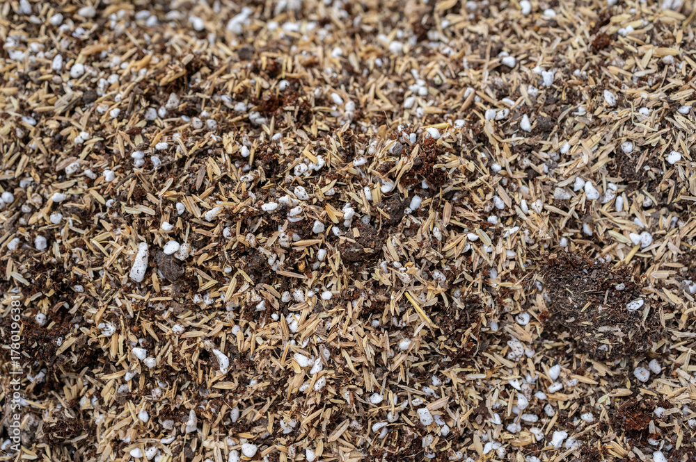 Full frame shot of potting soil mix and blend by coconut coir, rice husks, cow dung and Perlite. This soil is a soilless, man-made substrate specifically designed for growing plants.
