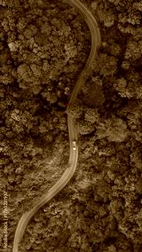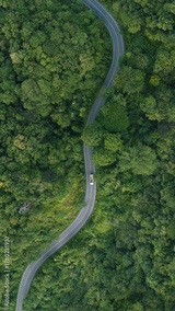 Aerial top view of a winding road cutting through lush green tropical forest. Scenic mountain highway surrounded by dense jungle trees, showing the beauty of nature and travel adventure concept.