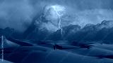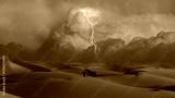 Camel caravan through the sahara desert in a sand storm with lightning strike between clouds