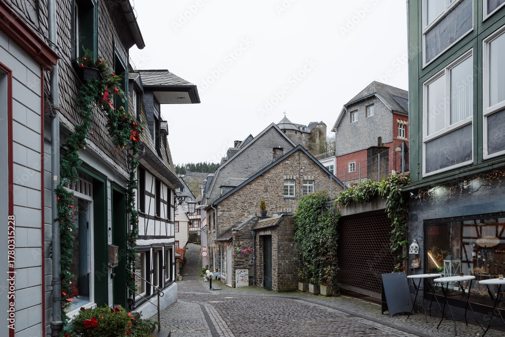 A picturesque view of a narrow cobblestone street in the historic center of Monschau, Germany.