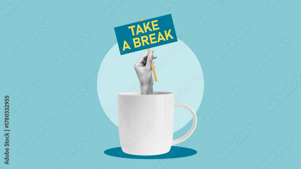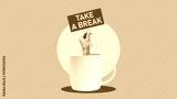 Take a break from work or little rest. Collage with a hand with sign from the coffee cup
