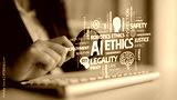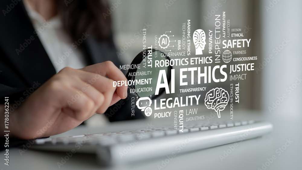 A professional engages with a keyboard while key terms related to artificial intelligence ethics and legality float around them, symbolizing a significant discourse in today digital age. Tessel