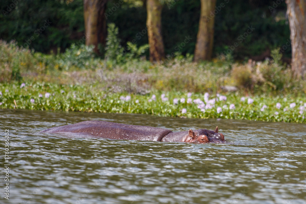 Hipopótamo (Hippopotamus Amphibius) Emergido del Agua Abriendo la Boca con Colmillos Visibles en un Lago de Kenia, África