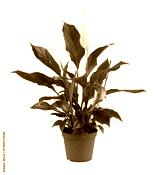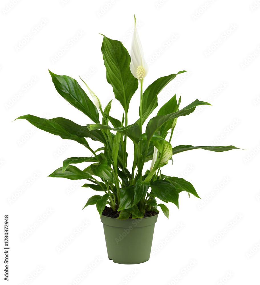 White flowers and green leaves of Spathiphyllum in a pot isolated on white or transparent background
