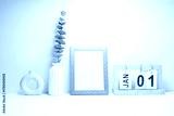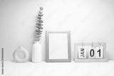 Mockup Wooden Photo Frame Next to Jan 01 Flip Calendar and Eucalyptus Plant