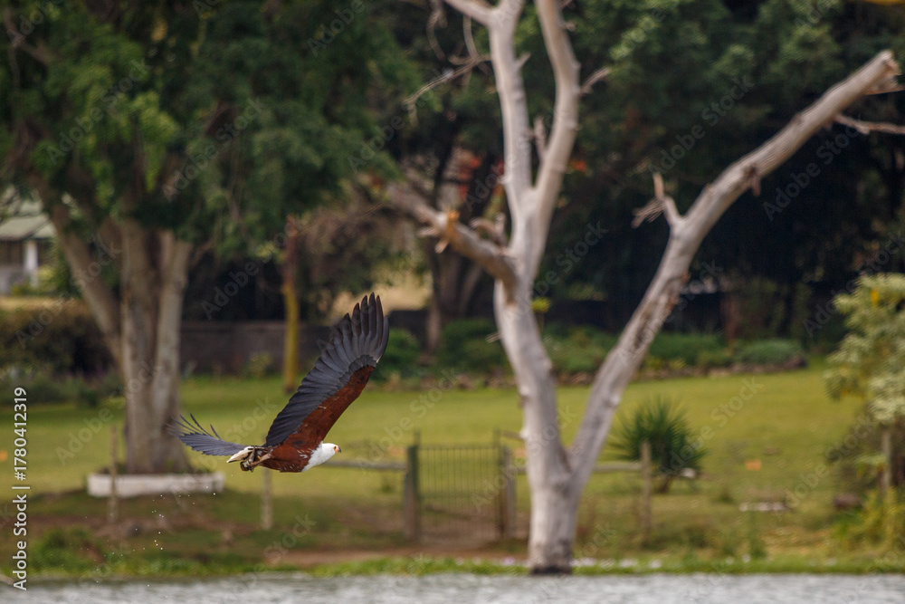 Águila Pescadora Africana (Haliaeetus Vocifer) Volando Bajo sobre la Superficie de un Lago en Kenia con las Garras Extendidas