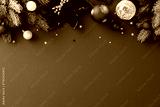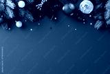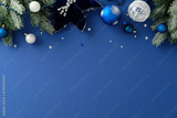 Blue Christmas or winter holiday background with snowy pine branches, baubles, poinsettia and silver stars. Symmetrical festive composition with copy space for seasonal greeting or ad