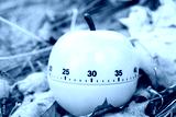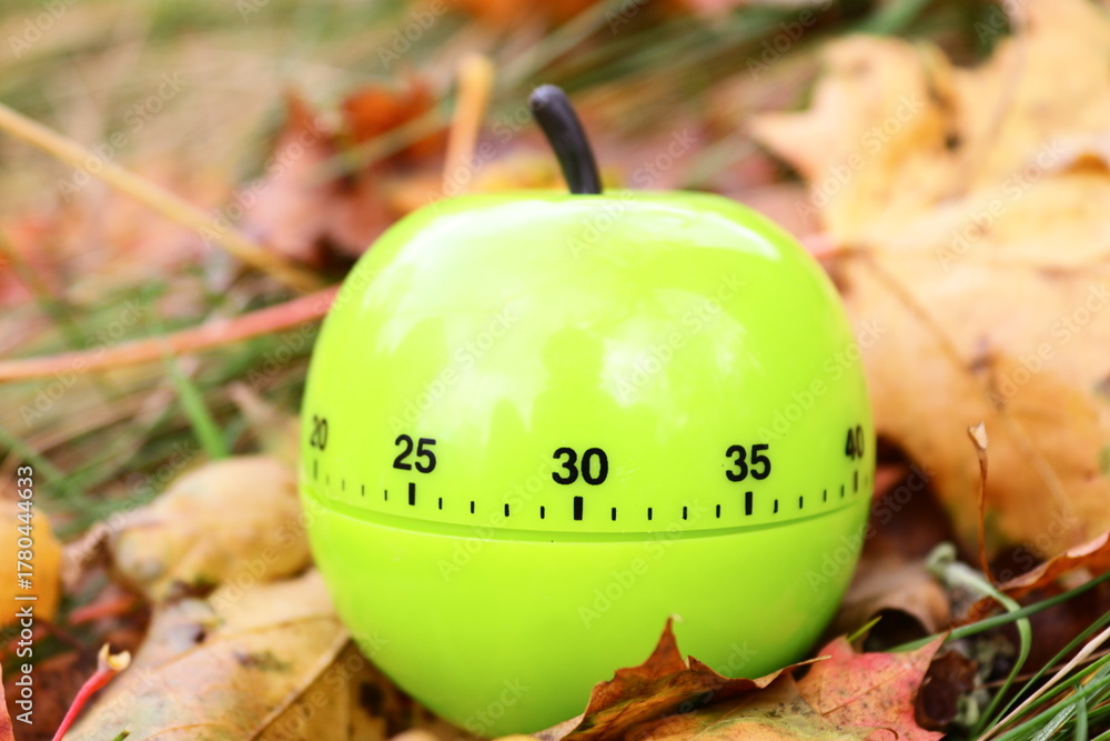 A single green apple timer sits atop a heap of fallen leaves in autumn