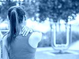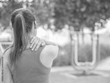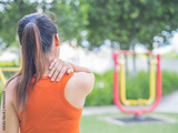 Young asian woman feel pain on her neck and shoulder while exercising, health care concept.
