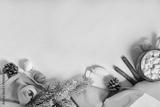Festive flat lay with Christmas theme and decorations and cocoa on an isolated background