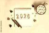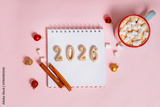 Festive flat lay in a Christmas theme with figures for the year 2026 and decorations and cocoa on an isolated background