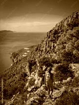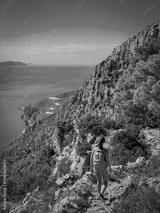 Fit female hiker with backpack walks along narrow cliffside trail with stunning view of blue sea below. Authentic moment of summer adventure and outdoor exploration along the sunny island of Hvar.