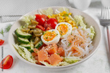 Buddha bowls of salmon, boiled egg, tomatoes, corn, cucumber, Shirataki noodles and sesame. Asian cuisine.