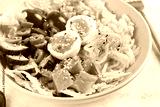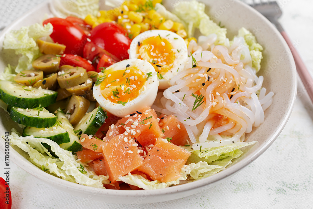 Buddha bowls of salmon, boiled egg, tomatoes, corn, cucumber, Shirataki noodles and sesame. Asian cuisine.