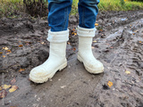 Children's feet in white rubber boots on the muddy side of the road after the rain.
