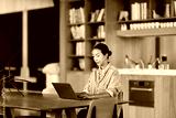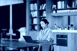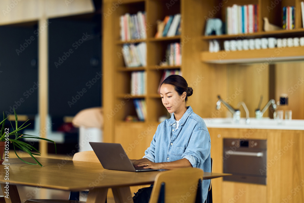 Asian Woman Working on Laptop at Modern Home Office Kitchen Island and Library