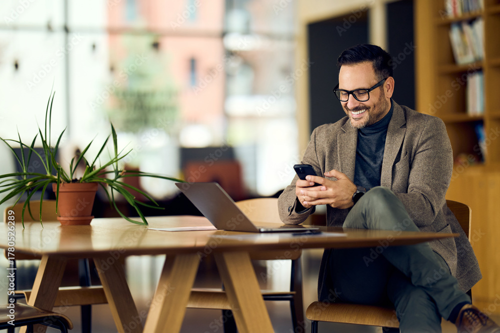 Professional Man in Blazer Uses Phone at Modern Office With Laptop and Plant