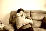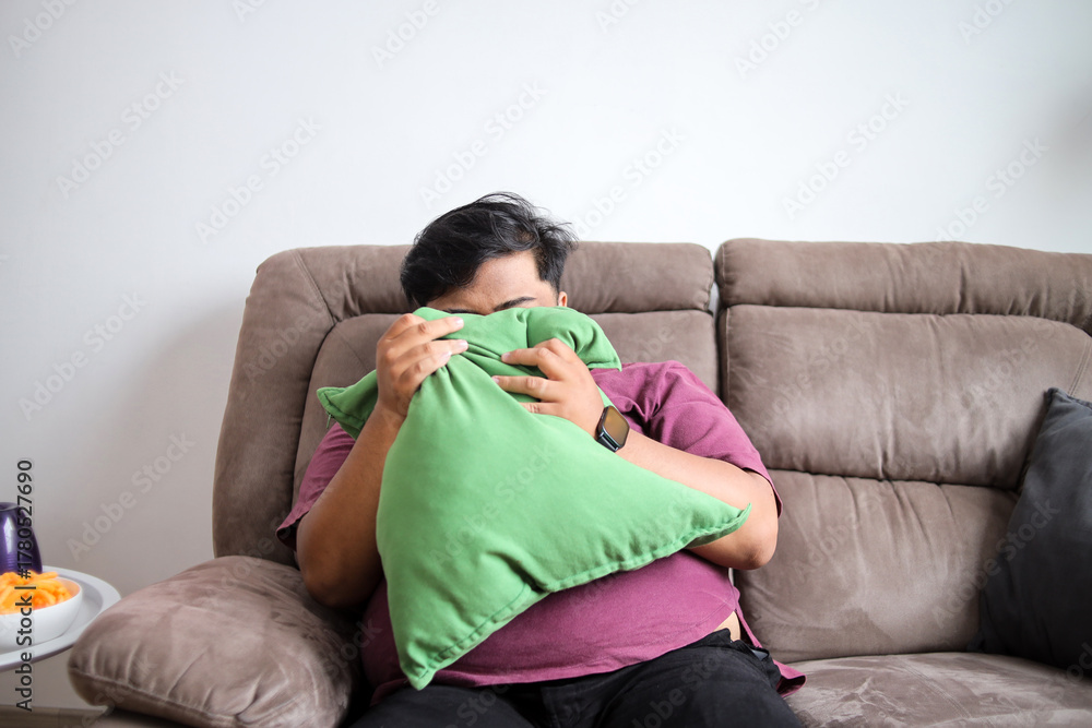Anxious and Overwhelmed Fat Man Needs Comfort Holding Pillow Tightly on Sofa